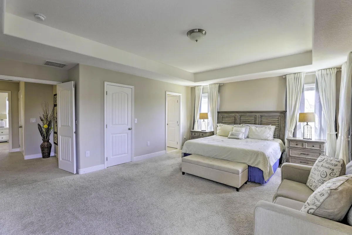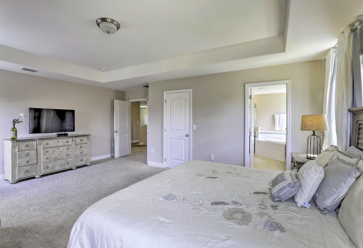 INDOOR LIVING: 3 living rooms with large sectional sofas, 6 flat-screen TVs, Roku and smart TVs with access to streaming apps using your own credentials, 8-seat dining table, laptop friendly desk, 2 master bathrooms with king beds and en-suite bathrooms, one with jetted tub. 5 bedrooms on second floor, with 2 king beds. 1 king bed on first floor.
