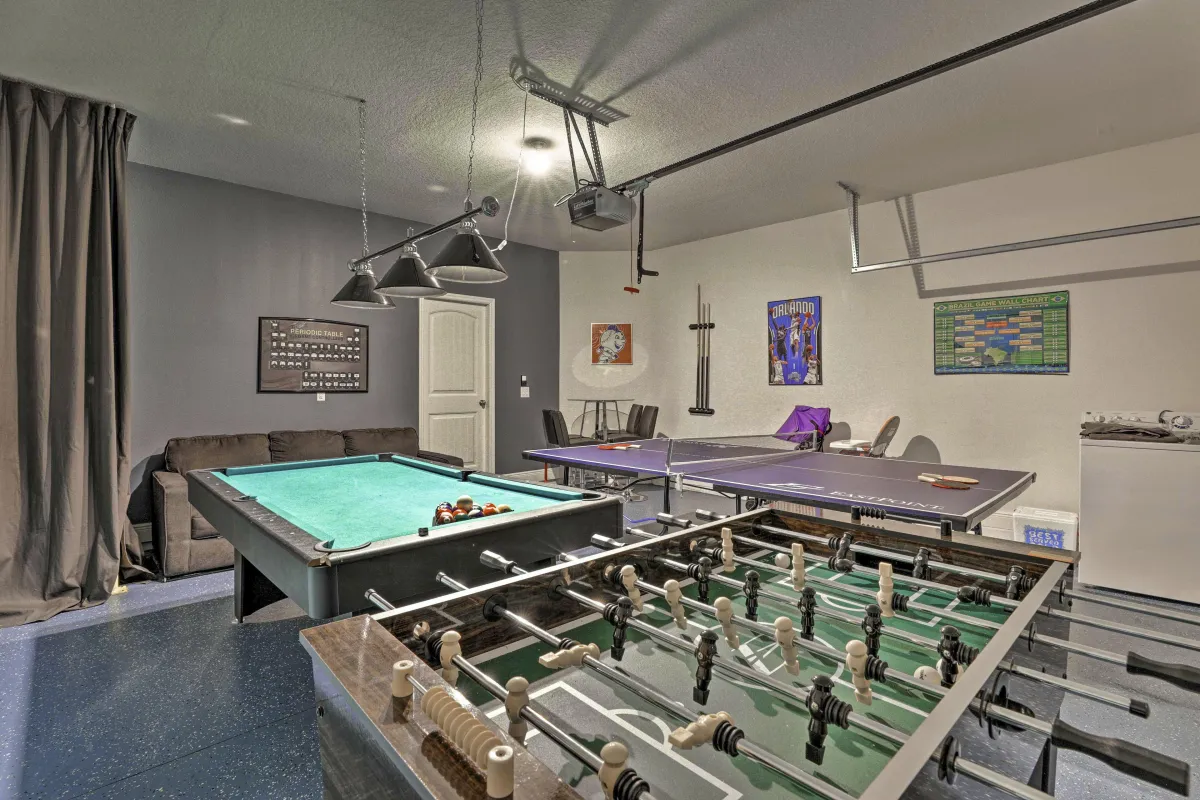 GAME ROOM: Pool table, ping pong, foosball in garage